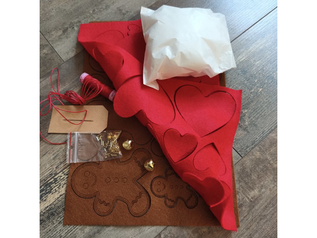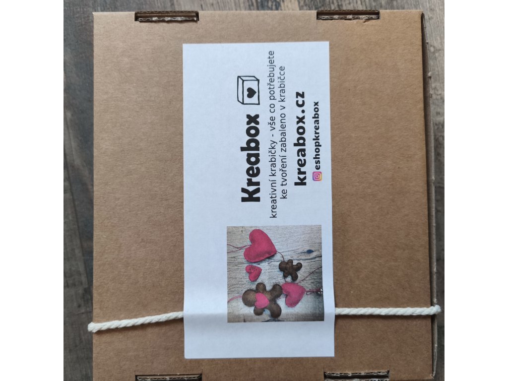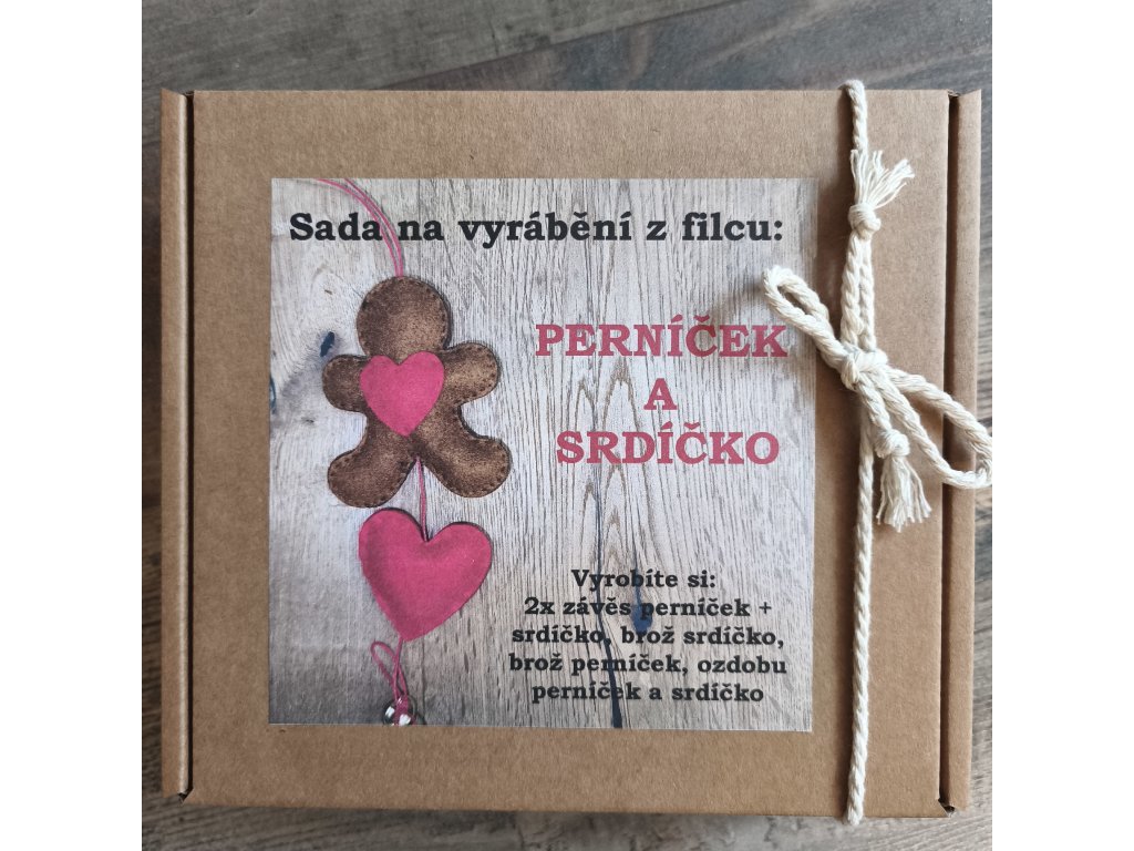 Toto je sada na výrobu, tzn. v kreaboxu (krabičce) najdete vše potřebné k výrobě filcových dekorací v dekoru perníčku a srdíčka.